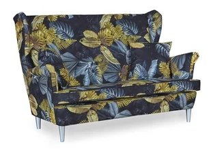 Sofa Dwuosobowa ARI PRINT w stylu skandynawskim. Sofa, której dotyczy aukcja, wykonana została w tkaninie POLY 3 - złote oraz szare liście monstery na czarny...