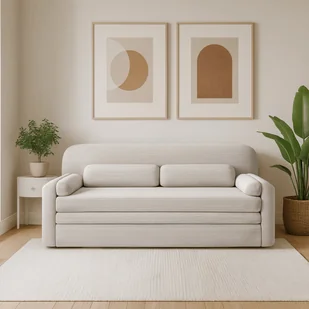 Sofa z funkcją spania ELIOSS jasnobeżowa Sofa Elioss to mebel, który łączy w sobie nowoczesny design i pełną wygodę użytkowania. Jej uniwersalna forma pasuje zarówno do wnętrz minimalistycznych, jak i nowoczesnych aranżacji, a starannie wykończone detale sprawiają, że prezentuje się wyjątkowo elegancko i stylowo. Dlaczego warto ją wybrać? - Komfort każdego dnia - obszerne siedzisko o długości 198 cm, wypełnione pianką T2540, zapewnia wygodę podczas wypoczynku. Oparcie wykonane z tego samego materiału gwarantuje stabilne podparcie dla kręgosłupa.