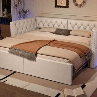 Ta tapicerowana sofa rozkłada się z 90 x 200 cm do 180 x 200 cm po wysunięciu łóżka. Format 90 x 200 cm jest idealny dla dzieci lub codziennego użytkowania, natomiast 180 x 200 cm świetnie nadaje się dla gości.