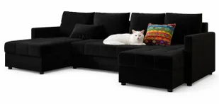 Dlaczego właśnie ? narożnik w kształcie litery „U” – idealny do wspólnego spędzania czasu wygodne siedzisko i cztery miękkie poduszki oparciowe wypełnione zmieloną pianką dwie dodatkowe poduszki dekoracyjne w zestawie funkcja spania z dużą powierzchnią 265 × 130 cm praktyczny pojemnik na pościel – zawsze pod ręką wolnostojąca konstrukcja z tyłem obitym tkaniną solidny stelaż z drewna i płyty wiórowej komfortowe wypełnienie z pianki T30 odpornej na odkształcenia stabilne, okrągłe nóżki z tworzywa sztucznego (wys. 4,5 cm) Materiały i wykonanie Tkanina - gęsta i aksamitna tkanina obiciowa typu velvet posiadająca bardzo dobrą odporność na ścieranie (do 100 000 cykli - test Martindale). Wypełnienie z pianki elastycznej - gwarantuje sprężystość, komfort i trwałość nawet przy intensywnym użytkowaniu. Sprężyna falista - zapewnia elastyczne podparcie siedziska, zwiększając trwałość i komfort użytkowania narożnika. Solidna konstrukcja - drewniany stelaż i mocne elementy nośne zapewniają stabilność oraz długowieczność mebla. Wymiary: Głębokość: 140 cm, szerokość: