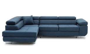 Duży narożnik , nowoczesny, lewy, Rigatto, 270x200x71 cm, granatowy. Narożnik Rigatto to mebel, który wyróżnia się niezwykłą funkcjonalnością. Regulowane zagłówki umożliwiają dostosowanie kąta nachylenia względem szyi i głowy użytkownika, co zapewnia dodatkowe podparcie, a przy tym maksimum komfortu . Chromowane efektowne nóżki ułatwią sprzątanie, a zastosowany system rozkładania typu delfin w szybki i prosty sposób zamieni narożnik w strefę sypialnianą. Do produkcji zastosowano elastyczną piankę T35 oraz sprężynę falistą , dzięki którym poczujesz najwyższy poziom wygody.