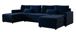 Dlaczego właśnie ? narożnik w kształcie litery „U” – idealny do wspólnego spędzania czasu wygodne siedzisko i cztery miękkie poduszki oparciowe wypełnione zmieloną pianką dwie dodatkowe poduszki dekoracyjne w zestawie funkcja spania z dużą powierzchnią 265 × 130 cm praktyczny pojemnik na pościel – zawsze pod ręką wolnostojąca konstrukcja z tyłem obitym tkaniną solidny stelaż z drewna i płyty wiórowej komfortowe wypełnienie z pianki T30 odpornej na odkształcenia stabilne, okrągłe nóżki z tworzywa sztucznego (wys. 4,5 cm) Materiały i wykonanie Tkanina - gęsta i aksamitna tkanina obiciowa typu velvet posiadająca bardzo dobrą odporność na ścieranie (do 100 000 cykli - test Martindale). Wypełnienie z pianki elastycznej - gwarantuje sprężystość, komfort i trwałość nawet przy intensywnym użytkowaniu. Sprężyna falista - zapewnia elastyczne podparcie siedziska, zwiększając trwałość i komfort użytkowania narożnika. Solidna konstrukcja - drewniany stelaż i mocne elementy nośne zapewniają stabilność oraz długowieczność mebla. Wymiary: Głębokość: 140 cm, szerokość: