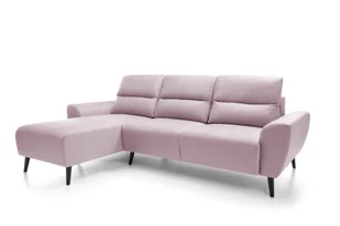 Narożnik bosco manila 09 pudrowy róż lewy to elegancki, nieszablonowy i wygodny mebel do salonu, który łączy elementy stylu nowoczesnego oraz glamour. Trzyosobowy narożnik w kształcie litery l występuje w wariancie lewostronnym. Model posiada solidny stelaż wykonany z niezawodnego drewna. Minimalistyczne i smukłe nogi w ciemnym odcieniu kontrastują z siedziskiem, które wypełnia sprężysta pianka poliuretanowa. Mebel wypoczynkowy różowy wniesie do wnętrza subtelną, łagodną i romantyczną kolorysty