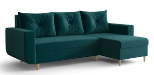 narożna forma z praktycznym szezlongiem – idealna do wypoczynku i spotkań z bliskimi, miękkie poduszki z dekoracyjnym pikowaniem zapewniające wygodę i estetykę, elegancka tapicerka łatwa do dopasowania w różnych wnętrzach, solidne, drewniane nóżki nadające stabilność i lekkość konstrukcji, styl pasujący do wielu aranżacji – od nowoczesnych po skandynawskie. Materiały i wykonanie Tkanina - Gęsta i aksamitna tkanina obiciowa typu velvet posiadająca bardzo dobrą odporność na ścieranie (do 100 000 cykli - test Martindale). Wypełnienie z pianki elastycznej - gwarantuje sprężystość, komfort i trwałość nawet przy intensywnym użytkowaniu. Solidna konstrukcja - drewniany stelaż i mocne elementy nośne zapewniają stabilność oraz długowieczność mebla. Wymiary: długość: 145 cm, szerokość: