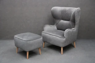 Fotel uszak "MOLI" + Pufa Materiał - Welur/aksamit - Odcienie popielatego Tkanina - Kronos 15 Drewniane jasne nogi Możliwość zamówienia w innym obiciu Próbki materiałów dostępne we wszystkich naszych sklepach stacjonarnych Zdjęcia przykładowe