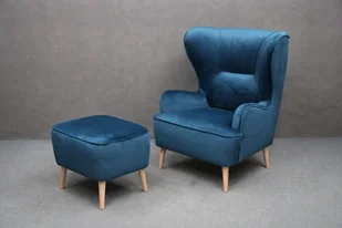 Fotel uszak "MOLI"+ Pufa Materiał - Welur/aksamit Odcienie niebieskiego Drewniane jasne nogi Możliwość zamówienia w innym obiciu Próbki materiałów dostępne we wszystkich naszych sklepach stacjonarnych Zdjęcia przykładowe Magazyn
