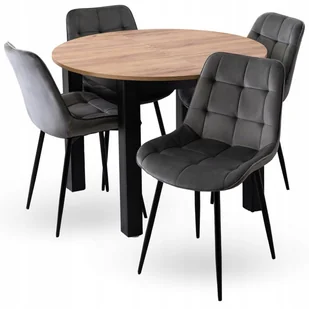 Zestaw mebli składa się z okrągłego stołu i czterech tapicerowanych krzeseł, idealnych do kuchni, jadalni, salonu, a nawet biura czy kawiarni. Stół w kolorze dąb craft ma funkcję rozkładania, co pozwala na zwiększenie jego długości z 102 cm do 142 cm. Czarne nogi dodają mu loftowego, industrialnego charakteru, co sprawia, że pasuje zarówno do nowoczesnych, jak i klasycznych aranżacji wnętrz. Krzesła Chris to połączenie nowoczesnego designu z wygodą. Siedzisko i oparcie mają lekko wklęsły kształt, co zapewnia komfort podczas siedzenia.