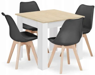 Drewno bukowe - naturalne, twarde i wytrzymałe drewno wykorzystane do produkcji nóg krzeseł, charakteryzujące się ciekawą strukturą i kolorem. Wymiary: Wymiary stołu: rozmiar blatu - 80 cm x 80 cm wysokość stołu - 75 cm grubość blatu - 1,8 cm przestrzeń między nogami - 44 cm Wymiary krzesła z zestawu: wysokość krzesła - 81,5 cm wysokość siedziska - 47 cm szerokość krzesła - 48 cm szerokość siedziska - 47 cm głębokość krzesła - 57 cm głębokość siedziska - 43 cm Najważniejsze informacje: