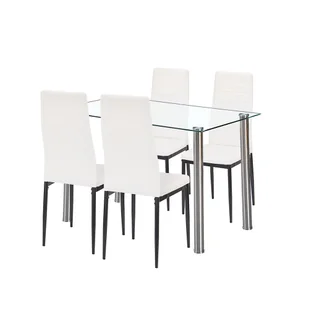 Mateo 4+1 étkezőgarnitúra – Letisztult modernség fehér-fekete székekkel és edzett üvegasztallalAsztal mérete: 120 × 70 × 75 cmAsztallap: 8 mm vastag, hőkezelt, edzett üvegAsztal lábai: Rozsdamentes fém lábak műanyag padlóvédő gyűrűkkelSzék mérete: 50 × 41 × 96 cm (ülőmagasság: 45 cm)Szék anyaga: