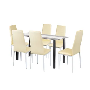 Norman 6+1 étkezőgarnitúra – Modern elegancia bézs színvilágbanAsztal mérete: 140 × 80 × 75 cmAsztallap: 8 mm vastag edzett üveg, füstszürke árnyalatbanVáz: Porszórt acél, fekete színbenTerhelhetőség: 60 kgSzék mérete: