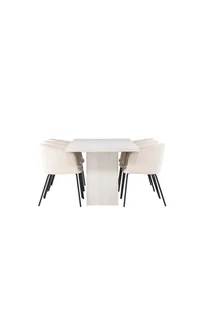 Zestaw stołowy Olga, biały stół i 6 beżowych krzeseł Berit, to zestaw stołowy w kolorze białym, który wnosi do domu zarówno styl, jak i funkcjonalność. Zestaw stołowy Olga, biały stół i 6 beżowych krzeseł Berit. Stół WxHxD cm: 90x75x200. Krzesło WxHxD cm: 55x78x55. Wysokość siedziska cm: