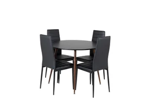 Zestaw stołowy PlazaBLWA100, stół w kolorze czarnym i 4 smukłe krzesła z wysokim oparciem ze sztucznej skórypoliuretan w kolorze czarnym to zestaw stołowy w kolorze, który wniesie do Twojego domu zarówno styl, jak i funkcjonalność. Zestaw PlazaBLWA100 stół do jadalni czarny i 4 smukłe krzesła z wysokim oparciem ze sztucznej skórypoliuretan w kolorze czarnym. Stół Plaza 60-17940-844. Øcm 100. stół cm: L100 x D100 x H75. stół: MDF, stal. Smukłe krzesło z wysokim oparciem 60-15031-888.