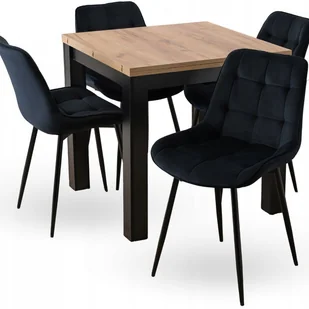 Zestaw stół MAX + 4 krzesła CHRIS – dąb craft / czerń Nowoczesny i funkcjonalny zestaw, który świetnie sprawdzi się w kuchni, jadalni, salonie, a nawet w stylowym biurze. Kwadratowy stół MAX w kolorze dąb craft posiada praktyczną funkcję rozkładania – po rozsunięciu jego długość zwiększa się z 80 do 160 cm. Blat wykonany z trwałej płyty MDF jest łatwy w utrzymaniu, a czarne nogi nadają całości nowoczesnego, loftowego charakteru. W zestawie znajdują się cztery krzesła CHRIS tapicerowane czarną tkaniną welurową z eleganckim pikowaniem. Siedzisko i oparcie są wygodne, lekko profilowane i wypełnione miękką pianką.