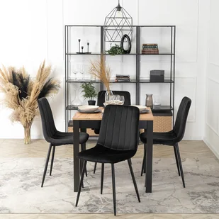 Zestaw stół rozkładany BEN i krzesła welurowe IBIS Czarne - elegancja i wygoda w jednym. Stół Ben z blatem dębu craft i funkcją rozkładania. Krzesła Ibis z welurową tapicerką i stalowymi nogami. Idealne dla każdego wnętrza, dodając uroku jadalniom i salonowi.