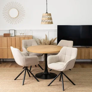 Zestaw stół okrągły LINO i 4 obrotowe krzesła tapicerowane PEONY beżowe marki Mebel Elite to połączenie nowoczesnego stylu i wygody do jadalni, salonu lub lokali gastronomicznych. Stół ma blat z laminowanej płyty MDF o grubości 4 cm w kolorze dębu złotego, który wiernie odwzorowuje rysunek drewna i jest odporny na codzienne użytkowanie, a czarna stalowa noga z okrągłą, talerzową podstawą zapewnia stabilność i lekki, designerski wygląd. Krzesła PEONY obite modną tkaniną bouclé są miękkie, trwałe i łatwe w czyszczeniu, kubełkowy fason z podłokietnikami oraz dekoracyjne pikowanie zwiększają komfort, siedzisko obraca się o 180° i dzięki funkcji memory basic position samo wraca do pozycji wyjściowej, a metalowa czteroramienna podstawa o matowym wykończeniu gwarantuje pewność użytkowania. Wymiary stołu: wysokość 75 cm, średnica 100 cm, grubość blatu 4 cm.