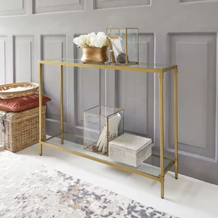 Zupełnie jak ta konsola, stworzona wyłącznie ze smukłej, prostej ramy i dwóch szklanych blatów. Jedynym elementem dekoracyjnym jest wykończenie w kolorze błyszczącego mosiądzu, stanowiące niezwykle elegancki akcent. To w gruncie rzeczy mało spektakularne połączenie sprawia, że ta konsola swoim indywidualnym charakterem odnajdzie się w najróżniejszych wnętrzach. Zwłaszcza, że cechuje ją nie tylko ponadczasowy design. Jest ona również płytkim meblem, dzięki czemu świetnie będzie pasować do małych pomieszczeń i wąskich przejść.