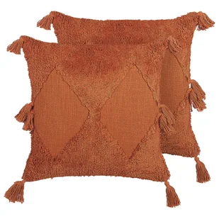 Nowoczesny, teksturowany zestaw poduszek dekoracyjnych wykonany z wysokiej jakości bawełny w stylu boho. Nadaj swojemu wnętrzu nowy wygląd dzięki temu zestawowi 2 poduszek dekoracyjnych, które są przyjemne w dotyku dzięki wysokiej jakości materiałom i specjalnej fakturze. Poszewki poduszek mają przyciągające wzrok geometryczne wzory i kilka frędzli wykonanych z miękkiej bawełny. Poduszki na sofę są również wyposażone w miękkie wypełnienia i zamki błyskawiczne dla wygodnego użytkowania. Odważny, pomarańczowy kolor sprawia, że zestaw przyciąga wzrok na każdej sofie, łóżku lub fotelu.