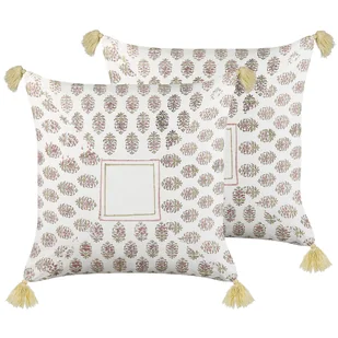 Ręcznie wykonane poduszki ozdobne z frędzlami. Uzupełnij wystrój swojego salonu tym zestawem poduszek dekoracyjnych w stylu romantycznym. Każda poszewka z bawełny posiada geometryczny wzór, ręcznie wykonany metodą druku blokowego i jest wyposażona w zamek błyskawiczny. Wysokiej jakości wypełnienie z poliestru nadaje poduszkom niesamowitą miękkość. Szczegóły: Typ produktu:
