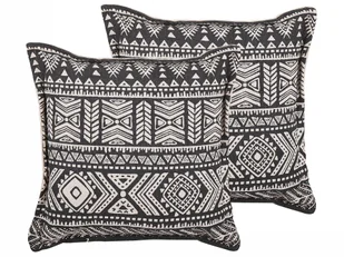 Kwadratowe poduszki z motywem w stylu boho. Udekoruj swoje mieszkanie za pomocą tych ozdobnych poduszek. Ich czarne powierzchnia pokryte są beżowym wzorem, złożonym z geometrycznych kształtów, które połączone ze sobą dodają poduszkom niezwykłego, rustykalnego klimatu. Poszewki produktu wykonane zostały z bawełny, dzięki czemu są one wytrzymałe i łatwe w utrzymaniu. Poliestrowe wypełnienie z kolei, zapewni komfort użytkowania podczas leżenia, a tył wykonany jest z materiału imitującego len, co dodatkowo dodaje uroku poduszkom.