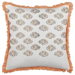 Ręcznie wykonana poduszka ozdobna z frędzlami. Ciesz się odmienionym wyglądem swojego wnętrza, dzięki tej poduszce dekoracyjnej. Jej wykonany ręcznie techniką stemplowania kwiatowy wzór, podkreślają pomarańczowe frędzle. Poduszka zrobiona została z bawełny i posiada poliestrowe wypełnienie oraz zamek błyskawiczny. Szczegóły: Typ produktu: