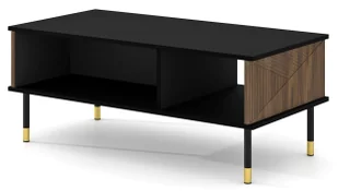 Nogi: stabilne 20 cm nogi z metalu nierdzewnego malowane proszkowo w kolorze czarnym ze złotym akcentem. 3 modne kolory: czarny + dąb catania, biały, czarny. Sprawdź naszą ofertę i wybierz idealny kolor dla siebie. Spójrz jak fenomenalnie prezentuje się ława kawowa Muvaw w przykładowej aranżacji.