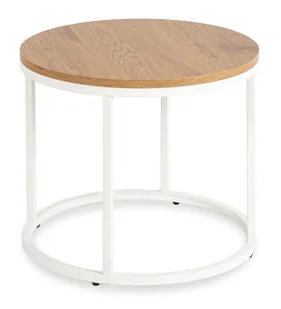 Efektowny design zamknięty w prostocie: elegancki, okrągły kształt pozwala na wiele możliwości aranżacyjnych surowy, minimalistyczny design podkreśla industrialny styl wnętrza gładki blat zapewnia wygodę użytkowania i łatwość w utrzymaniu czystości metalowa podstawa na bazie okręgu zapewnia stabilność i wizualną lekkość unikalne połączenie blatu z podstawą tworzy oryginalną konstrukcję Jak powstał stolik Evin? blat został wykonany z najwyższej jakości płyty MDF odpornej na uszkodzenia mechaniczne, charakteryzującej się podwyższoną trwałością i gęstością około 684 kg/m3 wg badania normy EN 323 blat o grubości 1,8 cm został dodatkowo pokryty trwałym laminatem, który gwarantuje odporność na zarysowania i wgniecenia, łatwość czyszczenia a także doskonały efekt wizualny solidna podstawa została wykonana z najwyższej jakości metalu odpornego na korozję i uszkodzenia mechaniczne, dzięki czemu zapewnia stabilność i trwałość Stolik jest dostępny w kliku wersjach kolorystycznych. Kliknij w link i zobacz wszystkie stoliki Evin 3X. Wymiary: Średnica: 53 cm, wysokość: 46 cm. Najważniejsze informacje: