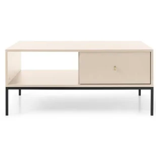 Nowoczesna ława na metalowych nogach, w stylu industrialnym, w eleganckim, beżowym kolorze.
