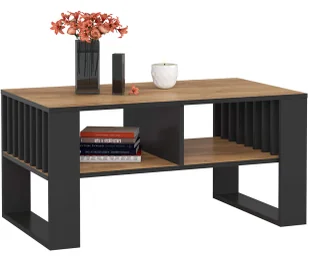 to harmonijne połączenie stylu i praktyczności, które wzbogaca każde wnętrze. Stolik kawowy z eleganckimi lamelami - doskonałe połączenie stylu i funkcjonalności: unikalne lamele po bokach nadają wyrafinowany charakter dwupoziomowa konstrukcja zapewnia dodatkową przestrzeń do przechowywania prostokątny kształt idealnie wpasowuje się w każde wnętrze doskonały do ozdabiania salonu oraz praktyczny na drobne przedmioty Wysokiej jakości materiały wykorzystane w produkcji stolika kawowego : Płyta wiórowa pokryta laminowaną powłoką - trwały i wytrzymały materiał meblowy, odporny na uszkodzenia mechaniczne, działanie wilgoci oraz łatwy w utrzymaniu czystości. Obrzeża ABS - tworzywo charakteryzujące się dużą wytrzymałością, odpornością na zarysowania oraz estetycznym wykończeniem krawędzi.