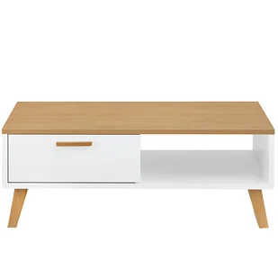 Biały stolik kawowy z szufladą i dodatkową przestrzenią do przechowywania Frisk marki KONSIMO jest wykonany ze stabilnej płyty laminowanej. Nogi i uchwyty zostały wykończone w litym drewnie. Szuflada i dodatkowa przestrzeń daje wystarczająco dużo miejsca do przechowywania drobnych przedmiotów.
