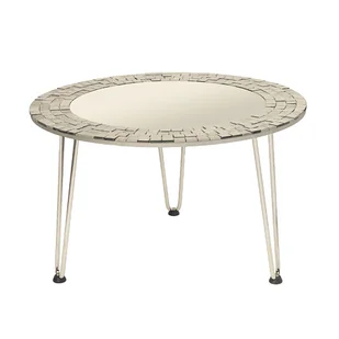 Stolik kawowy z lustrem, okrągły Gullo zdobiony szklaną, błyszczącą, srebrną mozaiką z trzema metalowymi nogami W zestawie znajduje się szkło hartowane które możesz położyć na stoliku. Stolik kawowy Gullo zaprojek ...