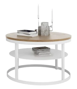 Metalowy stelaż z profilem 2 cm w kolorze białym zapewnia stabilność i trwałość stolika. Stolik posiada dwa poziomy, pierwszy wykonany z płyty laminowanej, a drugi z metalu. To idealne miejsce do przechowywania książek, dekoracji i innych przedmiotów. Okrągła forma stolika o średnicy 75 cm nadaje przestrzeni dużo miejsca do zagospodarowania. Podkreśl swój indywidualny styl z Kargo: