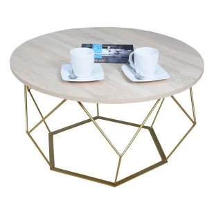 Materiał: najwyższej jakości metal pomalowany proszkowo odpornym na zarysowania i zadrapania, płyta laminowana o podwyższonej trwałości i gęstości. Kolor: stelaż: złoty, blat: dąb sonoma . Kliknij w link i sprawdź także inne okrągłe stoliki kawowe w sklepie Edinos. pl. Stwórz swóją praktyczną przestrzeń .