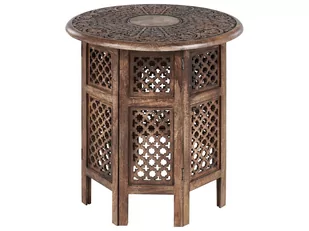 Wprowadź orientalny akcent do swojego wnętrza za pomocą tego funkcjonalnego, a jednocześnie dekoracyjnego stolika pomocniczego. Wykonany z najwyższą precyzją z drewna mango, nadaje naturalny charakter aranżacji dzięki widocznym słojom i strukturze tego materiału. Podstawa posiada wyjątkowy ażurowy wzór z ciekawymi rzeźbieniami, które z pewnością przyciągną uwagę każdego gościa. Dodatkowo jego kompaktowe rozmiary sprawiają, że jest idealnym dodatkiem do ograniczonych przestrzeni.