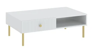 Stolik viena 2s złoty / biały to elegancki model utrzymany w nowoczesnym stylu, który zwraca uwagę dbałością o detal oraz ponadczasową kolorystyką. Powyższy stolik w kolorach bieli oraz złota tworzy zgrany i efektowny duet, który wprowadzi do wnętrza luksusowy akcent. Charakterystycznym elementem stolika intermeble jest ryflowany front zapewniający powierzchni wyszukany efekt. Złote akcesoria w postaci minimalistycznych uchwytów oraz cienkich nóg nadają konstrukcji lekkość i rozświetlenie. Wymi
