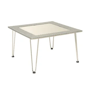 Stolik kawowy, kwadratowy Sarto wyłożony szarą, szklaną mozaiką z 4 chromowanymi nogami typu hairpin W zestawie znajduje się szkło hartowane które możesz położyć na stoliku. Dekoracyjny kwadratowy stolik kawo ...