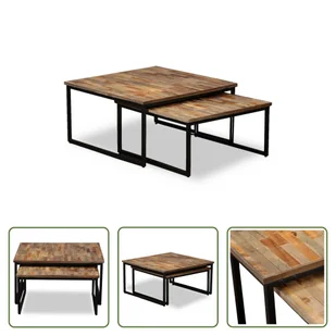 Ten fajny zestaw stolików kawowych w stylu industrialnym to ponadczasowy dodatek do Twojego domu. Ich solidne, drewniane blaty zapewniają stabilną i bezpieczną powierzchnię, na której można postawić napoje, wazony, miski z owocami lub przedmioty dekoracyjne. Mogą być również używane jako stoliki boczne. Ten zestaw stolików kawowych został wykonany z drewna tekowego pochodzącego z recyklingu. Oznacza to, że każdy mebel jest wyjątkowy.