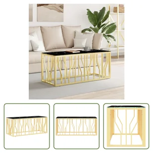 Złoty stolik kawowy 110x45x45 cm ze stali nierdzewnej i szkłaDzięki praktycznemu i atrakcyjnemu wizualnie designowi, ten stolik kawowy będzie przyciągał wzrok w Twoim pokoju. Wytrzymała i stabilna rama: Stolik posiada ramę ze stali nierdzewnej, która jest wytrzymała, stabilna i odporna na korozję i rdzę. Szklany blat: Ten stolik do salonu ma blat z hartowanego szkła o marmurowym wyglądzie, który przyczynia się do atrakcyjnego wyglądu stolika.