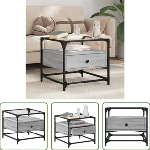 Stolik kawowy ze szklanym blatem szary Sonoma 50x50x45 cm stalowyDodaj odrobinę elegancji do swojego salonu dzięki temu stylowemu stolikowi kawowemu!Szklany blat: Blat oferuje widoczną i przestronną przestrzeń na przekąski, napoje, wazony, miski z owocami lub inne przedmioty dekoracyjne. Trwały materiał: Drewno inżynieryjne to wyjątkowej jakości materiał o gładkiej powierzchni, który charakteryzuje się wytrzymałością, stabilnością i odpornością na wilgoć. Solidny i stabilny: