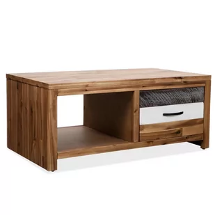 Stolik wykonano z litego drewna akacjowego, które zapewnia solidność i trwałość. Front szuflady pomalowano kontrastującymi kolorami (czarnym i białym), co nadaje całości wyjątkowy wygląd. Solidny blat sprawdzi się doskonale do postawienia napojów, przekąsek, koszy z owocami bądź innych przedmiotów dekoracyjnych. Szuflada i półka oferuję mnóstwo miejsca na poukładanie różnych rzeczy, takich jak: książki, czasopisma czy piloty. Montaż mebla jest łatwy.