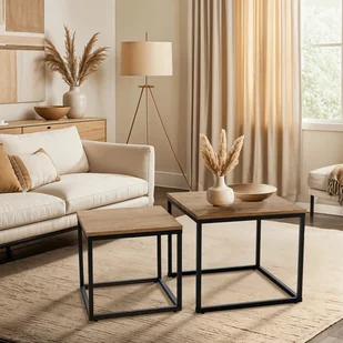 Zestaw stolików kawowych Carmi łączy styl i funkcjonalność. Wytrzymałe blaty z laminowanej płyty MDF w kolorze dębu złotego oraz stabilny metalowy stelaż w czerni. Mniejszy stolik można wsunąć pod większy, gdy potrzebujesz więcej miejsca. Idealny do różnych aranżacji i przestrzeni!