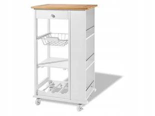 Cztery kółka ułatwiają przemieszczanie wózka kuchennego. Dane techniczne: Kolor: białyGłówny materiał: drewno sosnoweWymiary całkowite: ok. 67 x 37 x 87 cmWaga: