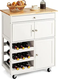 Opis produktu: Nasz wózek kuchenny ma dużo miejsca do przechowywania i odpowiada niemal wszystkim Twoim potrzebom: 2 przegrody z drzwiczkami na żywność, przyprawy i przybory kuchenne, szuflada na naczynia, takie jak talerze i noże, a dzięki 3 półkom na 3 butelki każda, możesz przechowywać swoje wino w schludny sposób. Wykonany z litego drewna sosnowego, praktyczny pomocnik kuchenny będzie służył przez długi czas. Ten wózek kuchenny z kółkami można łatwo przemieszczać w wybrane miejsce, np.