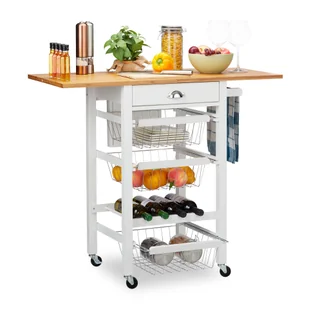 ok. 2,4 cm; 5 cm; 3 cm (2x) Zwijana szafka kuchenna w stylu wiejskim - Solidna rama z płyty MDF z bambusowym blatem - Dużo miejsca do przechowywania w 1 szufladzie, 3 koszach, na 1 półce - Przechowuj przybory kuchenne w zasięgu ręki i gotowe do użycia - Nowoczesny styl wiejski idealny do każdej kuchni - Kółka obrotowe 360° i praktyczny blok na noże - Do jadalni, salonu, na taras lub do sypialni Zakres dostawy - 1x wózek kuchenny - Z materiałem montażowym - Z instrukcją - Elementy dekoracyjne nie wchodzą w zakres dostawy