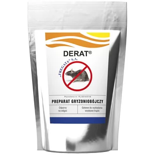ZASTOSOWANIE DERAT jako gotowa do użycia przynęta w postaci woskowych krążków przeznaczona jest do stosowania: wewnątrz i wokół budynków oraz na terenach otwartych (parki, korty tenisowe, kempingi i inne miejsca użyteczności publicznej)(użytkownik powszechny), wewnątrz i wokół budynków, na terenach otwartych (parki, korty tenisowe, kempingi i inne miejsca użyteczności publicznej), w systemach kanalizacji oraz na składowiskach odpadów (użytkownik profesjonalny). Produkt stosować jedynie w miejscach niedostępnych dla dzieci i zwierząt niebędących przedmiotem zwalczania (zwłaszcza psów, kotów, świń, drobiu, dzikiego ptactwa). SPOSÓB UŻYCIA DERAT musi być wykładany do dostępnych w sprzedaży, specjalnych, odpornych na manipulację, zabezpieczonych przed niepożądanym otwarciem, przytwierdzonych do podłoża karmników deratyzacyjnych w ilościach: po 100 g (7 krążków) przy zwalczaniu myszy (w odstępach co 3-4 m), po 200 g (14 krążków) przy zwalczaniu szczurów (w odstępach co 15 m).
