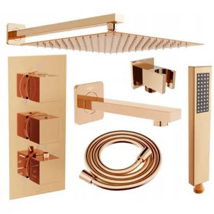 Różowe złoto Kształt: Kwadratowy Z termostatem: Tak Bateria: 3-wyjściowa Dysze boczne: Nie Wylewka wannowa: