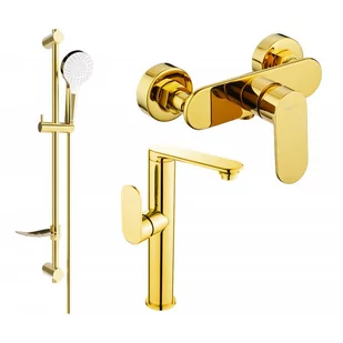 Stal nierdzewna, ABS Wykończenie drążka: Złoty Wysokość: 800 mm Szerokość drążka: 22 mm Odległość od ściany: 105 mm Mydelniczka Przesuwny uchwyt na słuchawkę Regulowane uchwyty montażowe Materiał słuchawki: