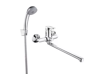 Klasyczna bateria wannowa z długą wylewką daje wygodę użytkowania. Bateria w komplecie z zestawem natryskowym.