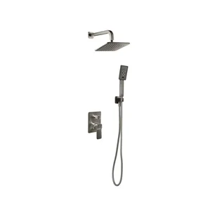 System prysznicowy podtynkowy Verdon: bateria prysznicowo-wannowa podtynkowa (SL7735GR); deszczownica mosiężna (WG220/OGR), rozmiar: 20 x 20 cm; ramię prysznicowe mosiężne (RA15GR); rączka prysznicowa (JIMJIM-RGR), 3-funkcyjna, rodzaj strumienia: deszcz, bicz, mieszany; wąż prysznicowy w oplocie stalowym (023-XGR), długość: 150 cm; przyłącze kątowe mosiężne (8815GR), z uchwytem na rączkę prysznicową Silikonowe wypustki typu EASY CLEAN umożliwiają wyczyszczenie deszczownicy i rączki prysznicowej z kamiennego osadu Komora deszczownicy została stworzona w technologii ANTI-SCALE.