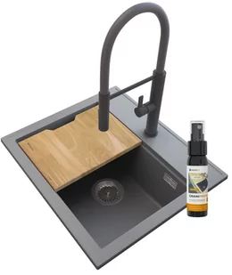 ZLEWOZMYWAK GRANITOWY FOXAL W KOLORZE SZARYM + FULL BATERIA KUCHENNA Z WYCIĄGANĄ WYLEWKĄ W KOLORZE CZARNYM + SYFON MANUALNY Z PROSTOKĄTNYM PRZELEWEM W KOLORZE CZARNYM + DEDYKOWANA WKŁADKA DREWNIANA + PREPARAT DO IMPREGNACJI ZLEWU OPIS PRZEDMIOTU 1. Zlewozmywak granitowy FOXAL w kolorze SZARYM FOXAL to wysokogatunkowy zlewozmywak granitowy wyróżniający się dwustopniową komorą. Model łączy w sobie klasyczną formę z przemyślanym, funkcjonalnym rozwiązaniem. Taki zabieg podnosi ergonomię pracy do maksimum. Górne krawędzie przeznaczone są na dedykowaną deskę kuchenną, która ułatwi zmywanie i zwiększy komfort podczas codziennych czynności.