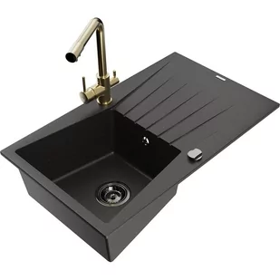 Czarny/Złoty metalik Kolor baterii: Złoty Dane techniczne: Zlewozmywak: Rozmiar: 775x470x200 mm Głębokość komory: 180 mm Wymiary komory: